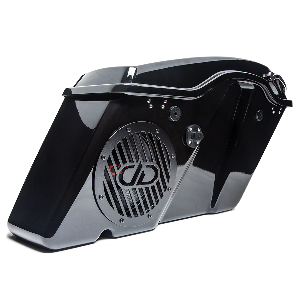 While most mounting kits simply convert saddle bags into loaded enclosures, DD’s Made in the USA kit allows riders to store bulky items and sensibly packed loose items in the front of the same bag as their fully enclosed 8” speaker without serious concern for the items or the speaker. The HD8-SBK also features a built-in utility tray with bungee straps, so riders can easily secure and quickly access small items stored in the bags. To protect speaker soft parts from road debris, DD includes an 8 inch matte black aluminum grill. This kit underwent thorough testing and prototyping with DD’s VO-W8, VO-XN8, VO-MN8, VO-M8 and RL-SW08 speakers to ensure optimum performance and compatibility. The clean design was tailor made for stock saddlebags on Harley-Davidson Street Glides, Road Glides, Ultra Glides, Electra Glides and Road Kings from 2014 to today. With professional installation, this USA Made kit will fit like a glove and look as if it came included fresh off Harley’s US factory line.